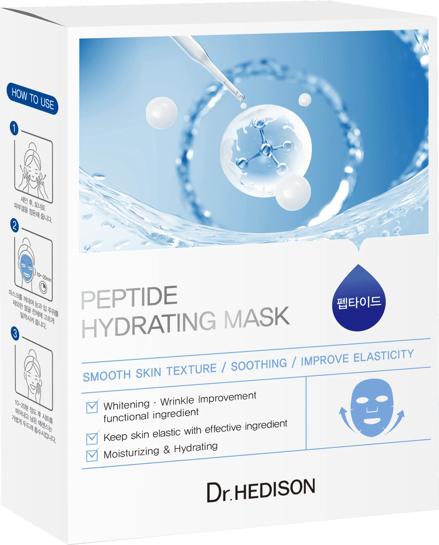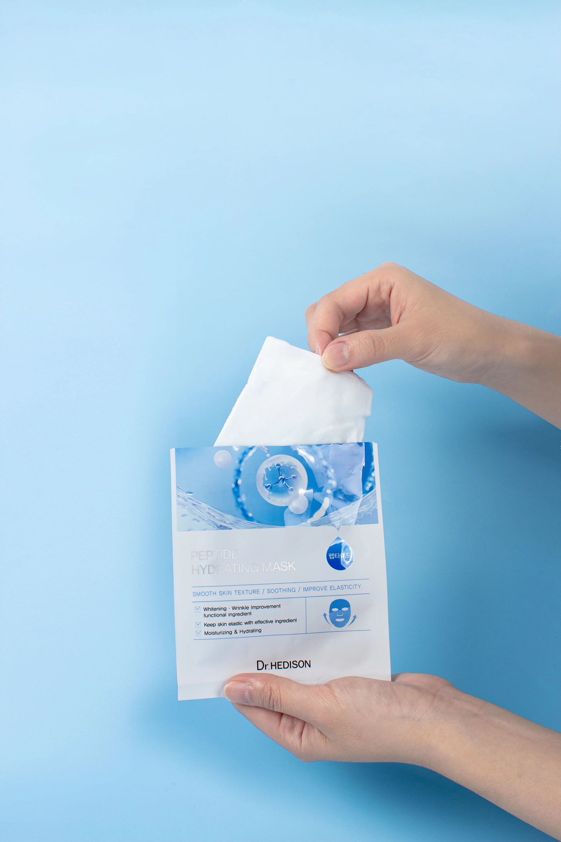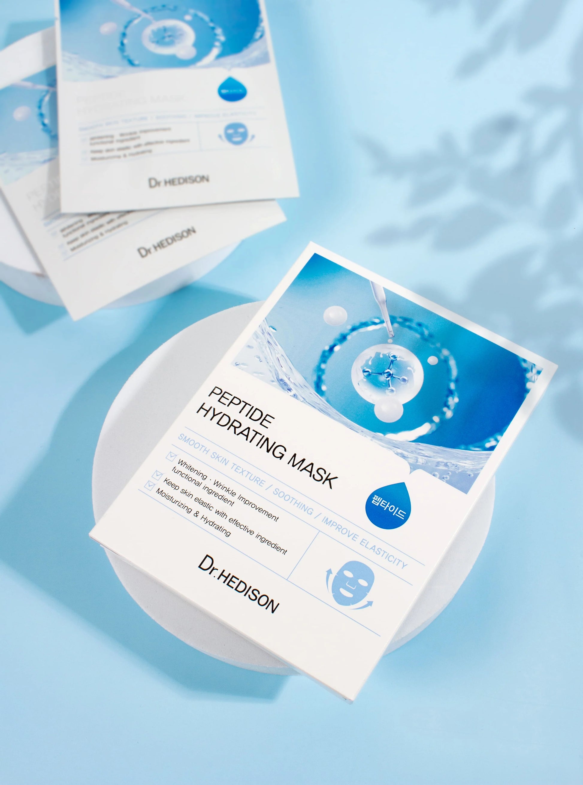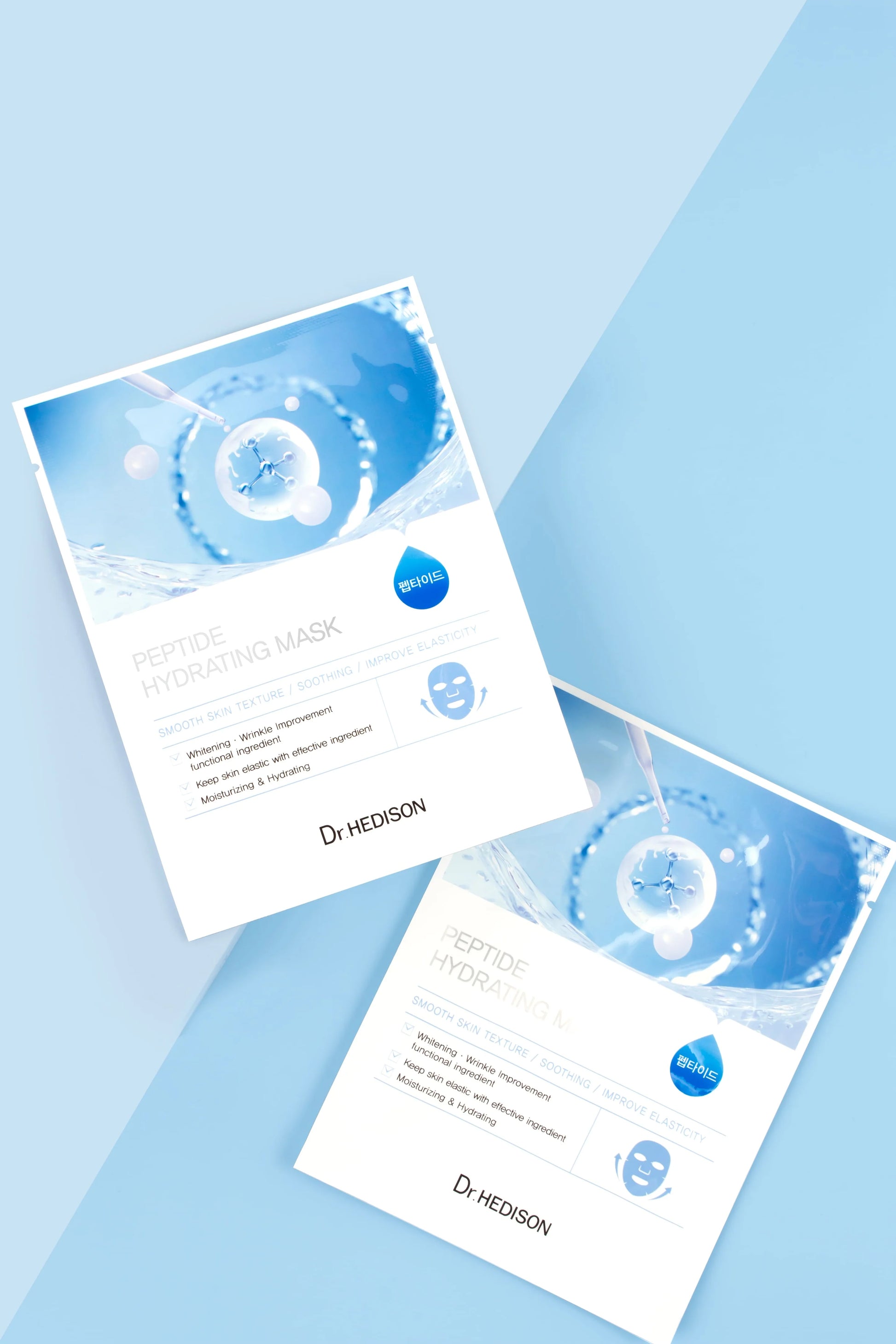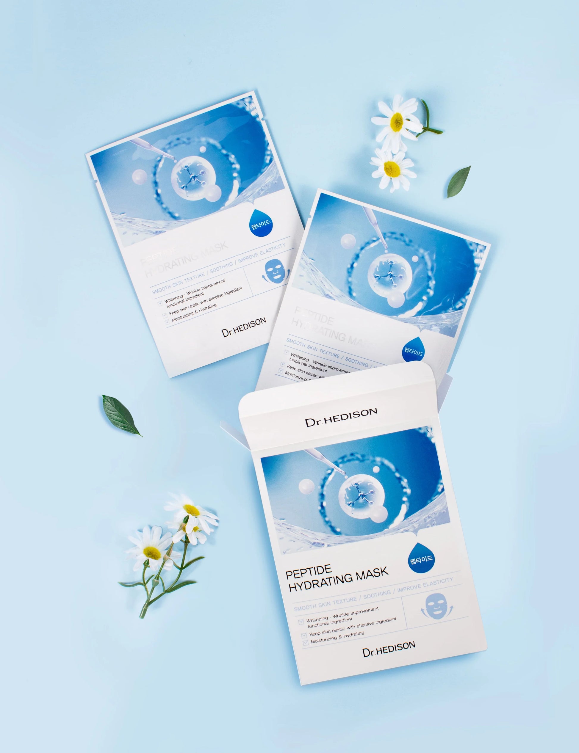 Зволожувальні маски-маски з пептидами від Dr. Hedison розроблені для інтенсивного зволоження шкіри, покращення еластичності та зменшення дрібних зморшок.